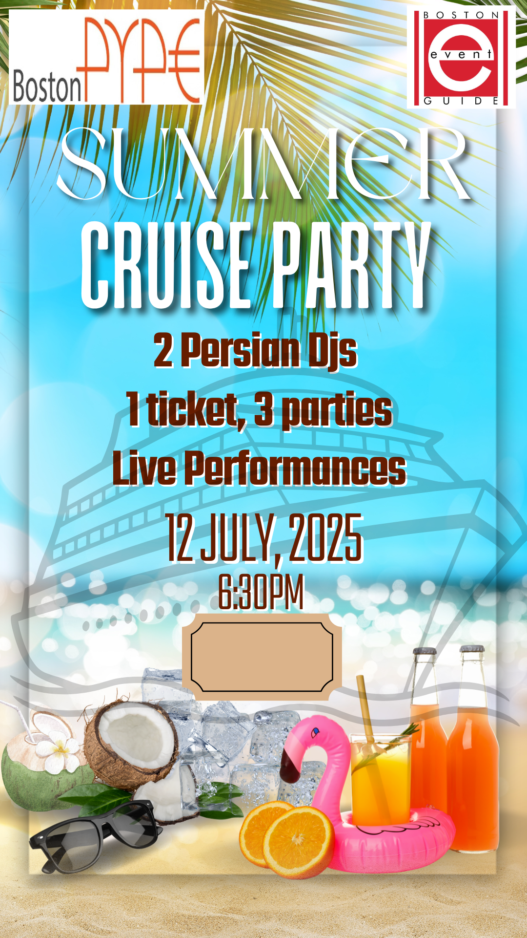 Event Details: Boston PYPE and PYPE Deals are partnering with Boston Event Guide’s Seaport Summer Cruises on 7/12 to create an epic cruise experience. We will have our own deck complete with our Persian DJs, and you can enjoy the entire 3 decks of music and fun.